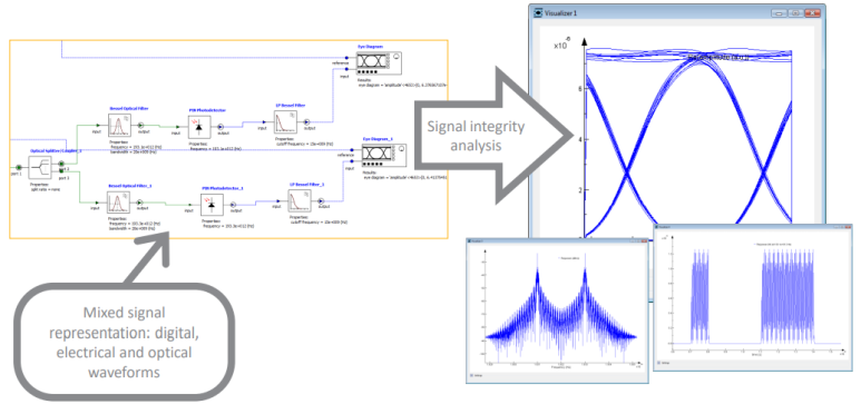 Lumerical의 광집적회로(PIC) 시뮬레이터인 INTERCONNECT는 다중 모드, 양방향 및 다중 채널 PIC를 검증할 수 있다. 계층적으로 구성된 회로도 편집기에서 프로젝트를 생성하면, 광범위한 기본 부품 라이브러리와 파운드리 별 PDK 부품을 사용하여 시간 또는 주파수 영역에서 분석을 수행할 수 있다.
