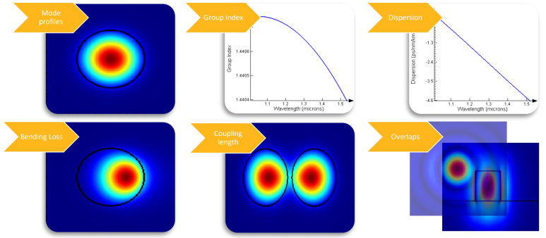 MODE는 광섬유 및 광직접회로에 사용되는 광도파관(Waveguide)과 커플러(Coupler) 설계에 필요한 모든 것을 갖추고 있다. 도파관의 모드 특성을 분석하는 FDE 솔버, 임의의 파를 도파관의 모드로 재구성하여 파의 진행 특성을 효과적으로 해석하는 EME 솔버, 그리고 FDTD 기반의 평판 도파관에 특화된 varFDTD 솔버의 다양한 툴을 제공한다. 특히, EME(Eigenmode Expansion Solver)는 양방향 도파관의 길이 최적화에 아주 효율적이며, varFDTD는 전방향에 대한 평판 소자의 전파(Propagation)의 분석에 효율적이다.