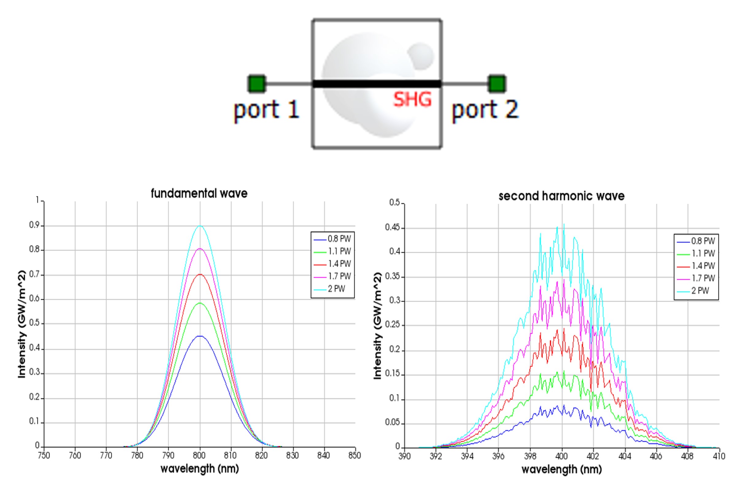 - INTERCONNECT의 새로운 nonlinear waveguide primitive (SHG Waveguide)는 LiNbO3로 만든 도파관과 같은 비선형 도파관에서 2차 고주 파 생성을 모델링한다.